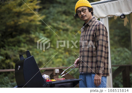 グランピング施設で夕飯の準備をする男性 お父さん