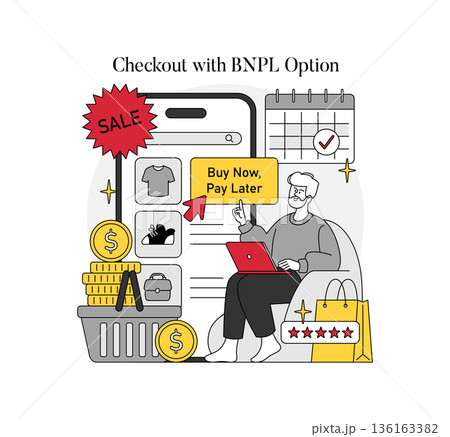 Buy Now Pay Later marketing strategy. BNPL installment payment options allowing consumers to purchase items immediately and pay for them over time. E-commerce consumer credit vector illustration