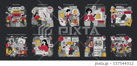 Vector illustration depicting various Black Friday shopping strategies. Scenes include planning, researching deals, mobile shopping, avoiding fake sales, sustainable choices, influencer tips, BNPL