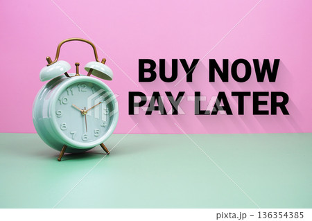 Black alarm clock on a pastel green and pink background with the text "Buy Now Pay Later"