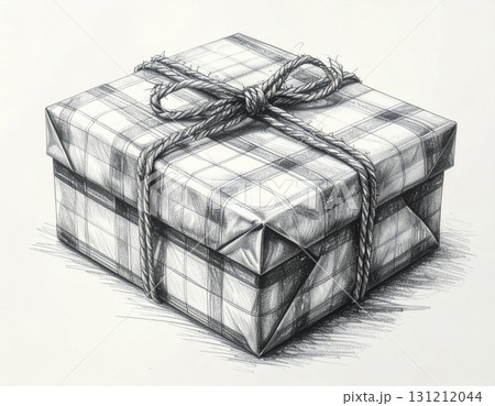 Cross Hatching Illustration of a Plaid Wrapped Gift with Rope on White Background