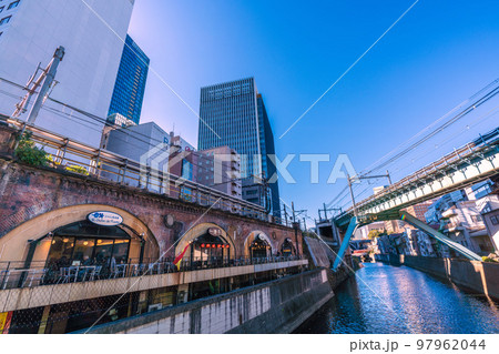 日本の東京都市景観 昌平橋から高架橋下の居酒屋や御茶ノ水駅方向・聖橋付近を望む。丸ノ内線も見える