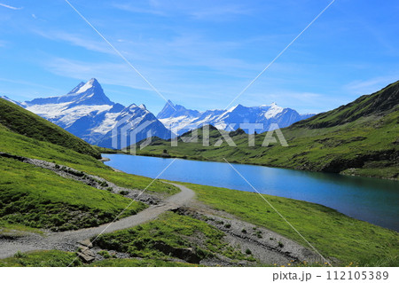 快晴の空とバッハ湖とシュレックホルン(スイス ベルン州)