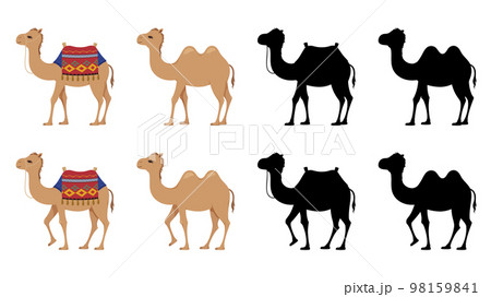 Camel with one or two humps on back silhouette. Dromedary dromedary. Arabic travel and transportation. Sahara journey. Wild and domestic mammal. Desert animal icon. Vector logo set