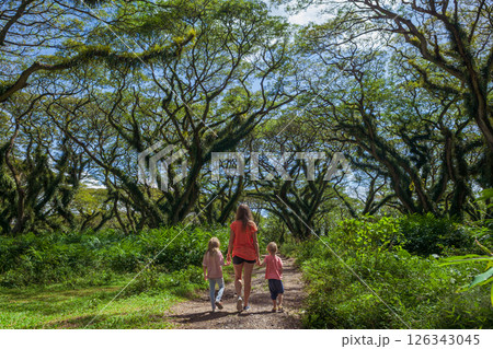Family under green canopy in ancient forest. Woodland walk past giant trembesi trees with huge trunks at Jawatan Benculuk Banyuwangi. Traveling with kids on summer vacation in Jawa island, Indonesia