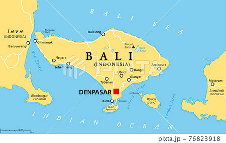 Bali political map, with capital Denpasar. A province and island of Indonesia, westernmost of Lesser Sunda Islands, east of Java, west of Lombok. The only Hindu-majority province in Indonesia. Vector.