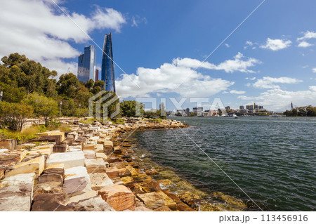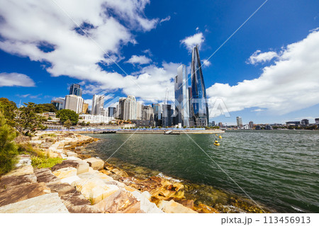 Barangaroo Reserve set against the CBD skyscrapers in Sydney, Australia on a bright sunny day