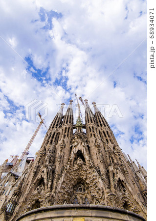 青空と雲とサグラダ・ファミリア 受難のファサード キリストの磔刑