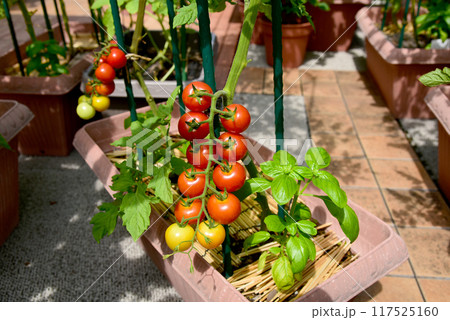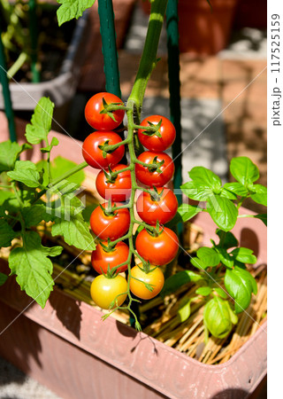 青空の下、マンションのバルコニー 家庭生活人気のトマトとバジルをプランター栽培 ミニトマトは食べごろ