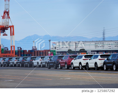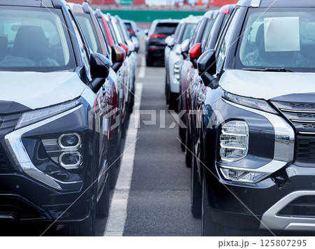 港にあるたくさんの輸出用の乗用車の風景