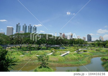 The large urban park with trails for running and cycling serene atmosphere with Benjakitti park skywalk.