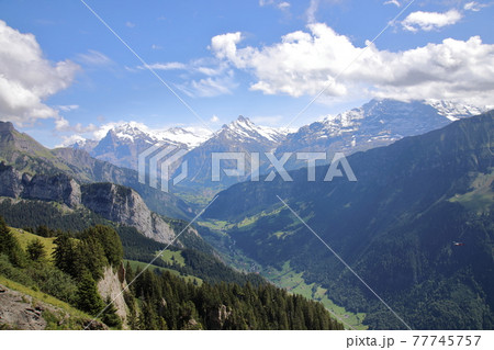 Scenery of Wengen mountain village with Lauterbrunnen valley and Jungfrau mountain in Bernese Oberland at Bern, Switzerland