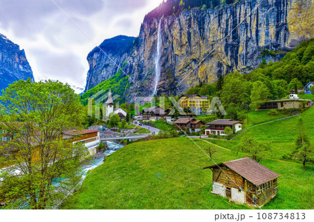 Traditional Chalets of village in Lauterbrunnen Valley at spring, Berner Oberland, Switzerland