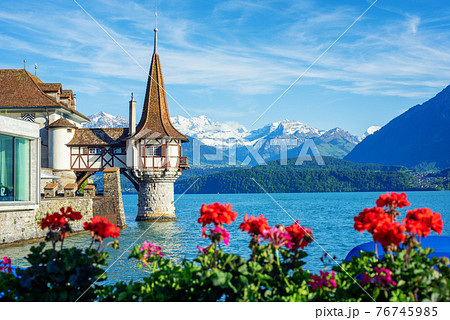 Oberhofen castle on Lake Thun, Switzerland, Alps mountains