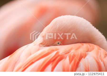 首を曲げて体に頭を密着させている鮮やかなピンク色をした美しいフラミンゴ
