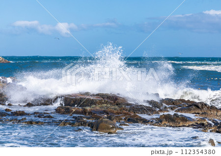 「青森県」岩に打ち寄せる荒波 波しぶき