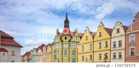 Facades of old houses in the market square in Boleslawiec, Poland.