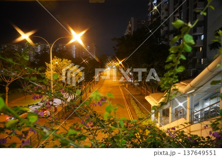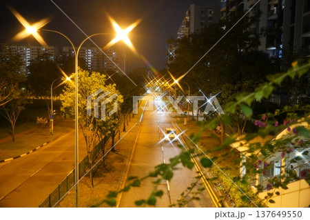 Night Road with Starburst Lights and Bougainvillea Blooms