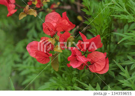 Vibrant red Bougainvillea glabra bracts close-up in high detail against dense, contrasting bright green garden leaves, focusing on texture and tropical beauty