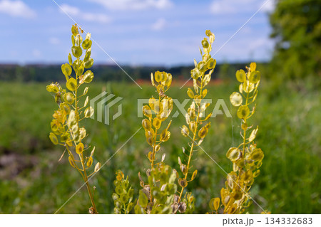 Field grass in early spring Shepherd's purse.