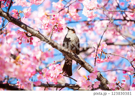 【河津桜】旧中川に咲く早咲きの桜に止まるヒヨドリ