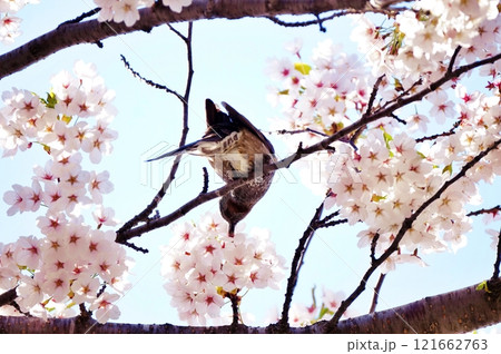 満開の桜の枝にとまるヒヨドリ