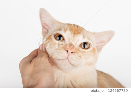 Human hand petting Burmese cat.