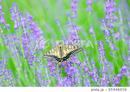 アゲハ蝶と紫色のラベンダー畑、北海道、富良野