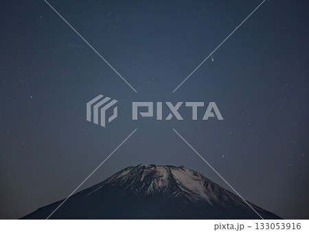 御殿場市街地から初冠雪の富士山に沈むレモン彗星
