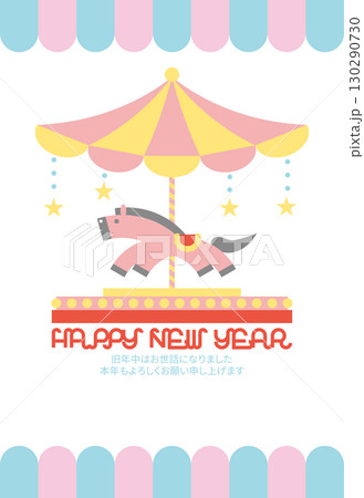 パステルカラーの木馬とストライプのメリーゴーランドの横型デザイン年賀状テンプレート