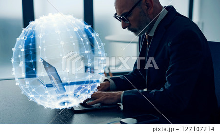 オフィスでパソコンを使う外国人男性とネットワークのコンセプトビジュアル