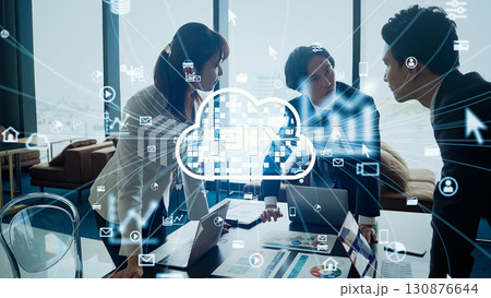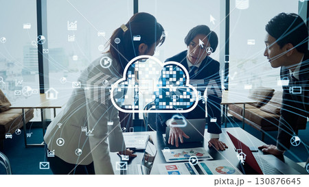 会議するビジネスパーソンのグループとクラウドコンピューティングのコンセプト