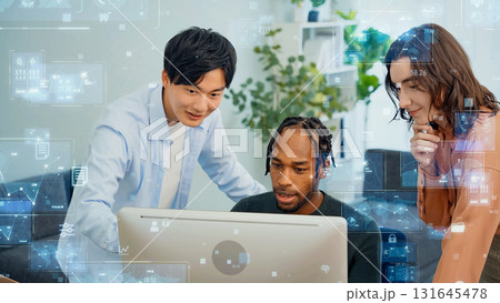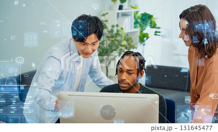 オフィスで会議する多国籍ビジネスパーソンのグループとデジタルテクノロジー