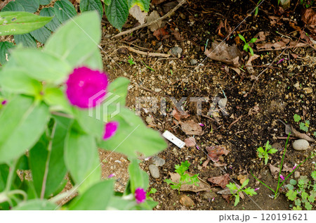 花壇の咲き誇る花たちの足元にポイ捨てされたタバコのフィルターが落ちている風景