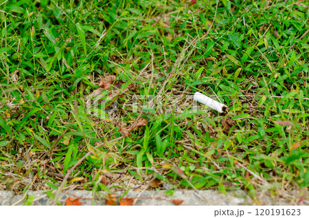 公園内の植生にポイ捨てされたタバコのある風景