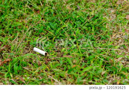 公園の敷地にポイ捨てされ火が消えた状態のタバコが落ちている風景
