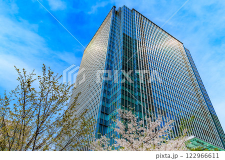 東京 中央区 日本橋室町の都市風景 日本橋室町三井タワーと満開の桜