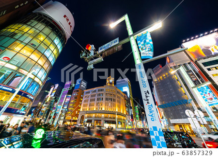 日本の東京都市景観 夜の銀座・新型肺炎・TOKYO2020=2020年3月20日(聖火が日本に到着)