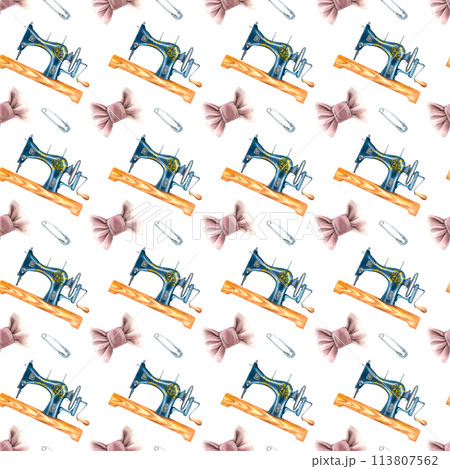 Seamless pattern with sewing machine, safety pin and pink bow for needlework. Hand drawn watercolor illustration used for background design, textiles, packaging, wallpaper, cards. Decor for clothes.