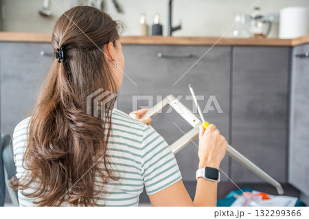 Smiling young woman assembling a chair with a screwdriver at home. Feminist concept celebrating female independence, confidence, and joy in do it yourself work.