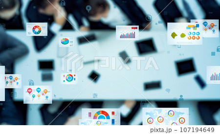 会議するビジネスパーソンのグループとデジタルテクノロジー