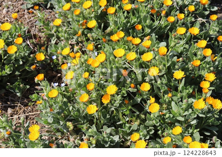 冬の庭に咲くオレンジ色のヒメキンセンカ(冬知らず)の花