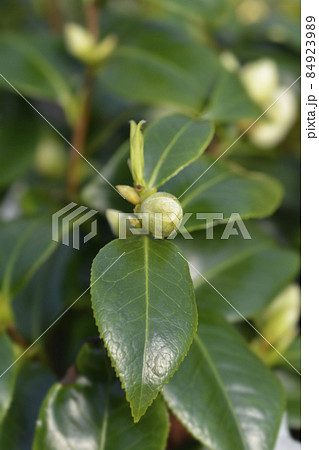 Closeup of flower bud of Camellia japonica 'Masayoshi' in Spring
