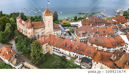 Switzerland travel and landmraks. Charming medieval town Murten (Morat) in scenic lake. aerial drone panoramic view. Idyllic places of Switzerland. canton Fribourg