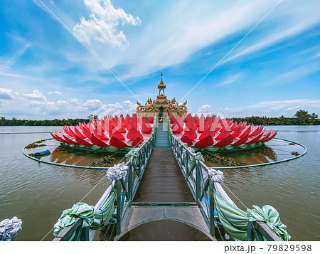 Aerial view of Wat Hong Thong with lake or sea, Chachoengsao near Bangkok City, Thailand. Thai buddhist temple archtecture. Tourist attraction.