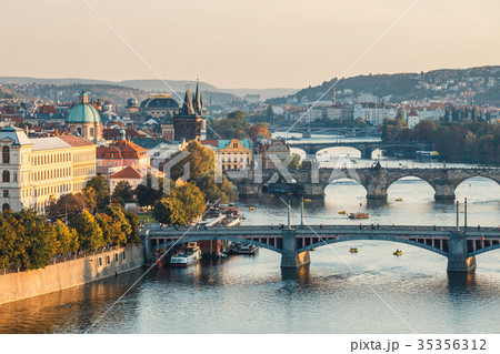 Prague panorama with Prague Castle, and Charles Bridge over Vltava River. View from Old Town Bridge Tower, Czech Republic