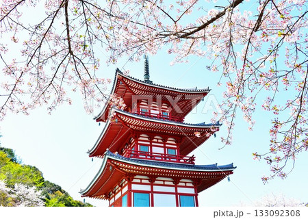 満開の桜に包まれた三重塔