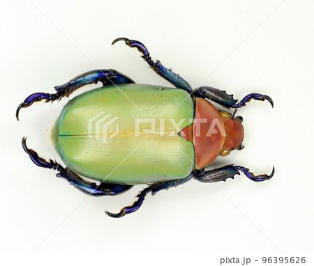 Beetle isolated on white. Green red leaf beetle Chrysina erubescens upside macro. Chysomelidae, colection beetles, coleoptera, entomology, insects