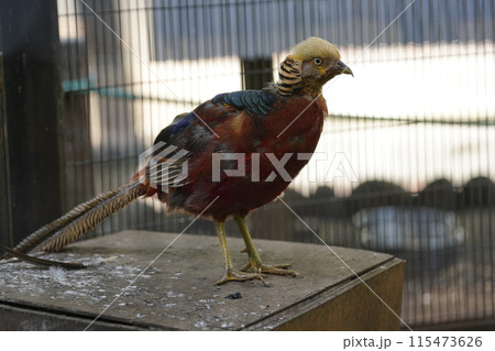 Golden Pheasant Bird Perched on a Wooden Branch in a Cage