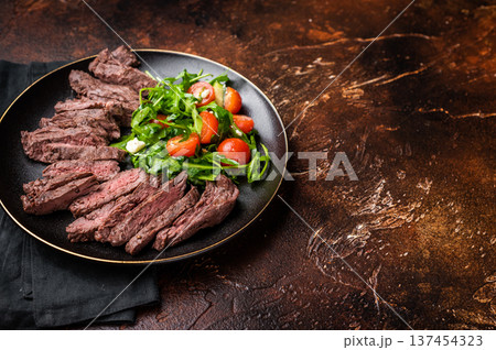 Grilled and sliced Beef Denver strip Steak on a plate with salad. brown background. top view